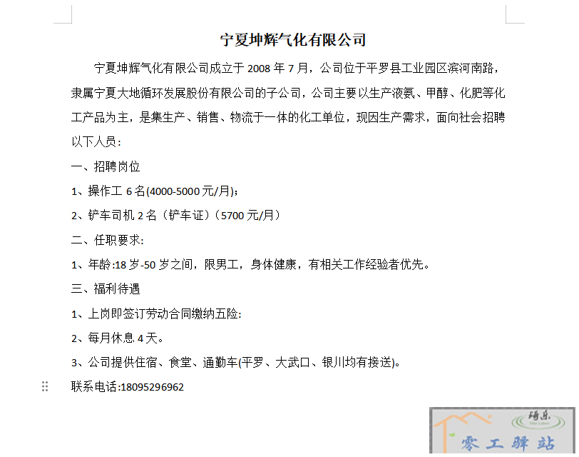 铲车司机 福利待遇 1、上岗即签订劳动合同缴纳五险: 2、每月休息4天。 3、公司提供住宿、食堂、通勤车(平罗、大武口、银川均有接送)。联系电话:18095296962